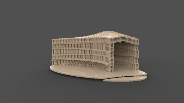 The pavilion bridges the gap between computational design processes and digital manufacturing using timber construction. This generative design process requires sorting assemblies into sub-categories and developing automated assembly procedures to manufacture them. The custom computational design workflow integrates fabrication limitations, assembly logics and design constraints using digital frameworks beyond the functionalities of commercial Computer-Aided Design (CAD) software programs to generate, store, and seamlessly transfer design data to automated assembly routines. This process of designing with nonstandard timber construction allows of for the pavilion to be constructed using small offcuts normally used for making wood chips. This project required the development of a custom robotic setup. This setup includes two KUKA KR60 robots, the development and automated integration of a rotating table saw, and various fabrication tools including custom gripper end-effectors. This project will continue to explore the architectural potentials of robotic fabrication technologies and challenge traditional the architectural production by creating seamless digital design-to-fabrication chains.